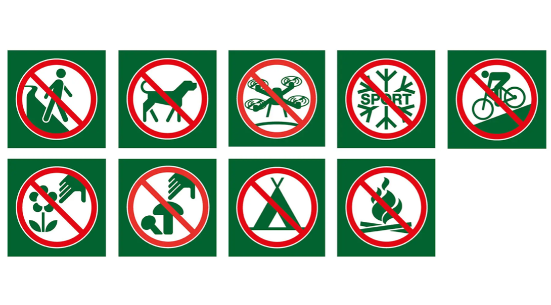 Image of regulations in the Swiss National Park. Source: https://nationalpark.ch/en/protection-regulations/.